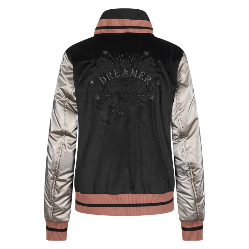 Overzicht"Blijf stijlvol en warm in het zadel met onze fluwelen gevoerde bomberjack. Met glanzende gecoate mouwen, een hoge rek kraag en unieke borduursel details."