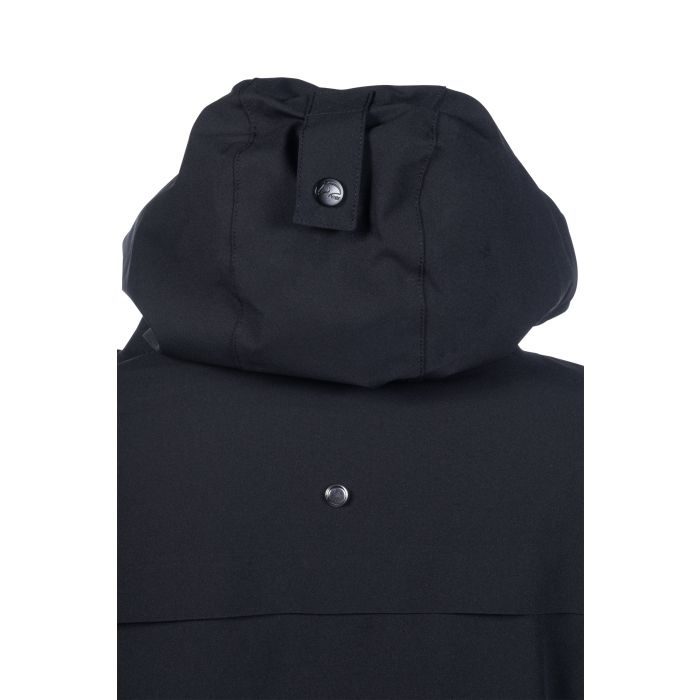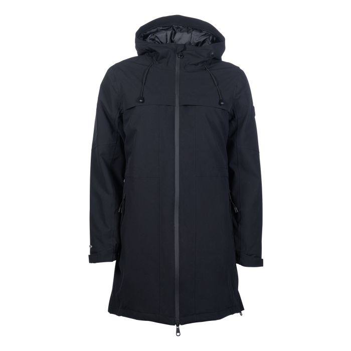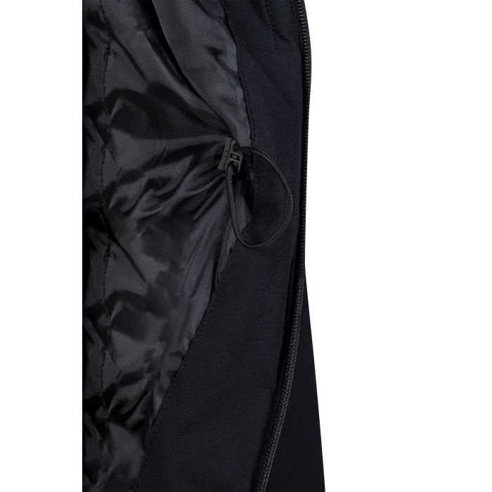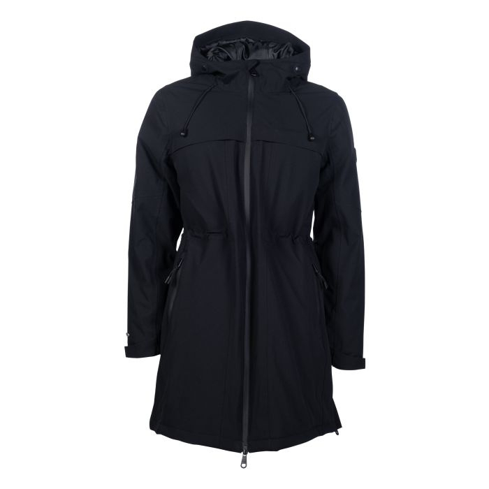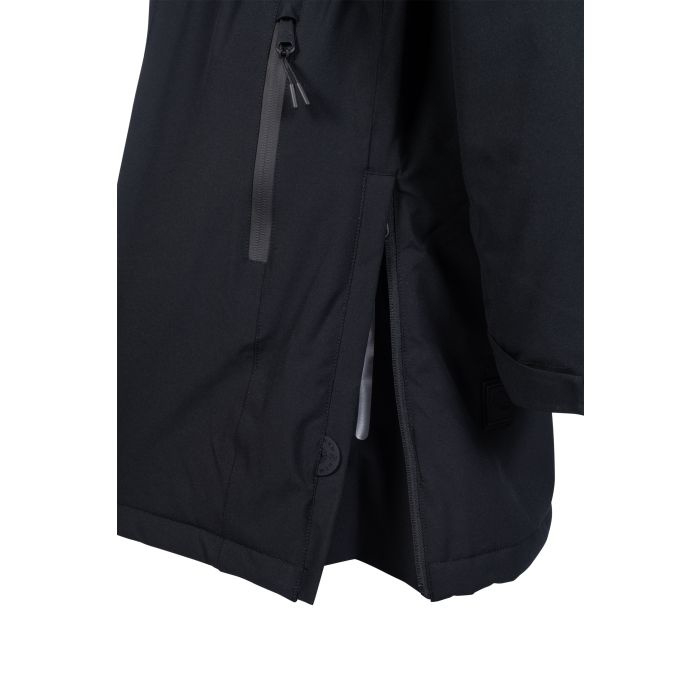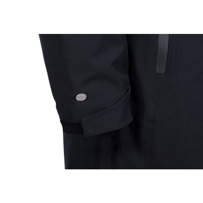 OverzichtWaterkolom: 3.000 mm Waterdichte tweewegritssluiting aan de voorkant met onderlap extra waterdichte buitenzakken Binnenzak Taille individueel in maat verstelbaar Kap kan vastgezet worden met een drukknoop Vaste capuchon met verstelbare buitenzoom Kap met moderne koordstoppers elastische manchetten Mouwzoom individueel verstelbaar met klittenbandsluiting lange rijsplitten aan de zijkanten met reflecterende interne print op geplooide onderkant verwijderbare sleutelhanger waterdicht membraanmateriaal Buitenstof: 100% polyester Voering: 100% polyester Vulling: 100% polyester wassen en drogen met ballen machinewasbaar op 30 graden geschikt voor de droger niet strijken Lengte qua maat S 88cm eenvoudige jasvorm met een modern juk
