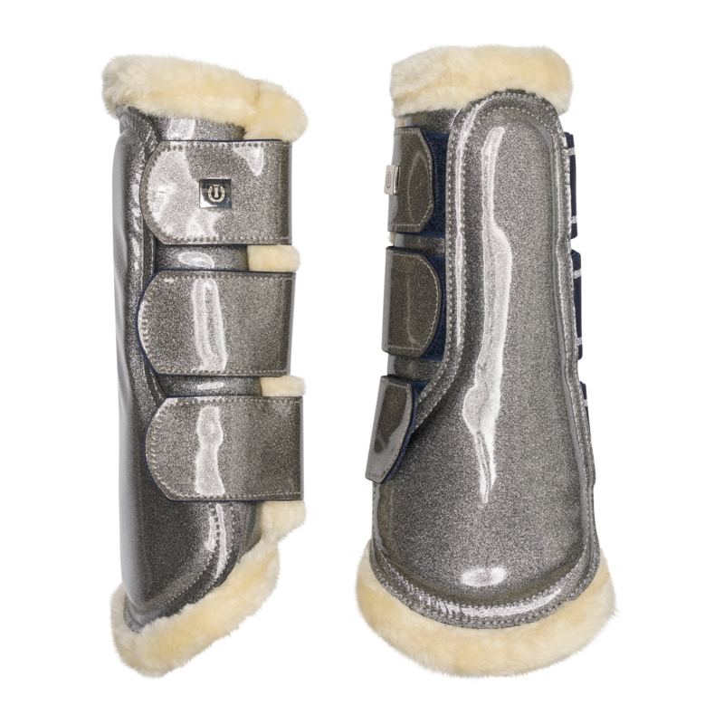 Chique beenbeschermers van glitter buitenstof met mesh voering. Omzoomd met zacht imitatiebont voor extra comfort.